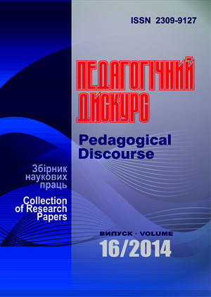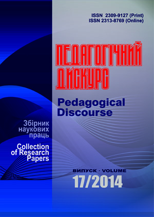 No 17 (2014)Collection of scientific papers «Pedagogical Discourse» contains the articles of theoretical and experimental character on the topical problems of theory and history of pedagogics, school organization and management, methods of teaching, upbringing and career guidance of students in educational establishments and out-of-school institutions, theory and methods of education management, professional formation of students, pedagogical practice, comparative pedagogics, social pedagogics, multistage pedagogical education, etc.