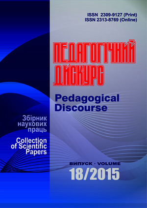 No 18 (2015)Collection of scientific papers «Pedagogical Discourse» contains the articles of theoretical and experimental character on the topical problems of theory and history of pedagogics, school organization and management, methods of teaching, upbringing and career guidance of students in educational establishments and out-of-school institutions, theory and methods of education management, professional formation of students, pedagogical practice, comparative pedagogics, social pedagogics, multistage pedagogical education, etc.