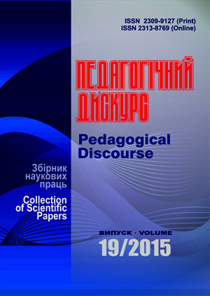 No 15 (2013)Collection of scientific papers «Pedagogical Discourse» contains the articles of theoretical and experimental character on the topical problems of theory and history of pedagogics, school organization and management, methods of teaching, upbringing and career guidance of students in educational establishments and out-of-school institutions, theory and methods of education management, professional formation of students, pedagogical practice, comparative pedagogics, social pedagogics, multistage pedagogical education, etc.